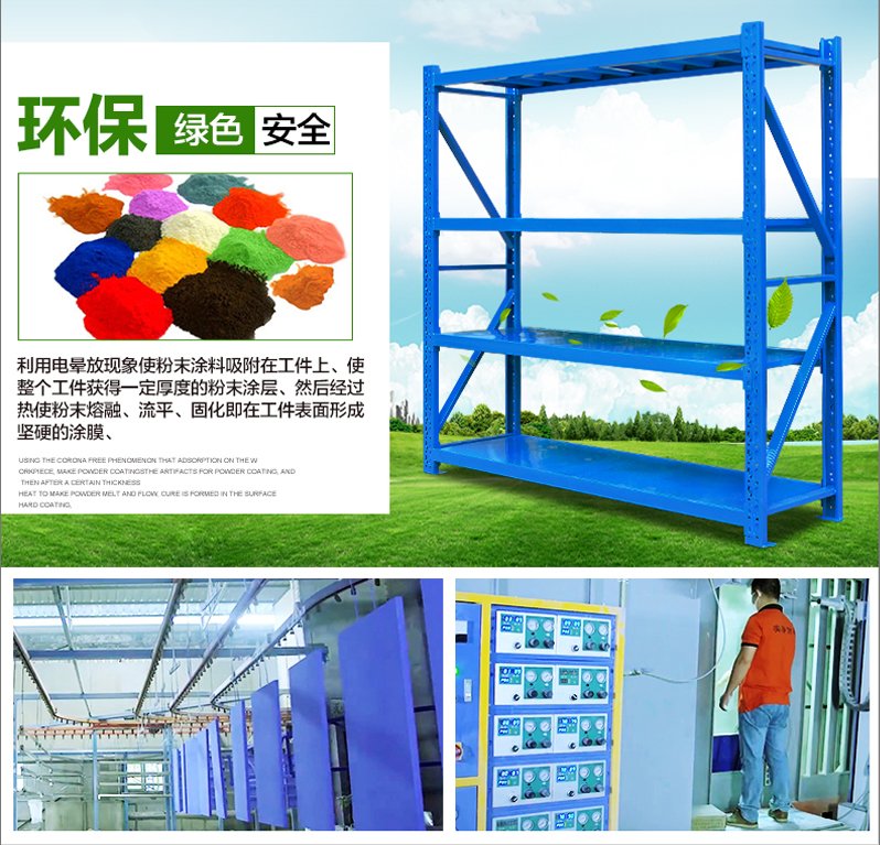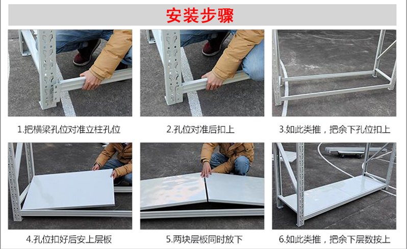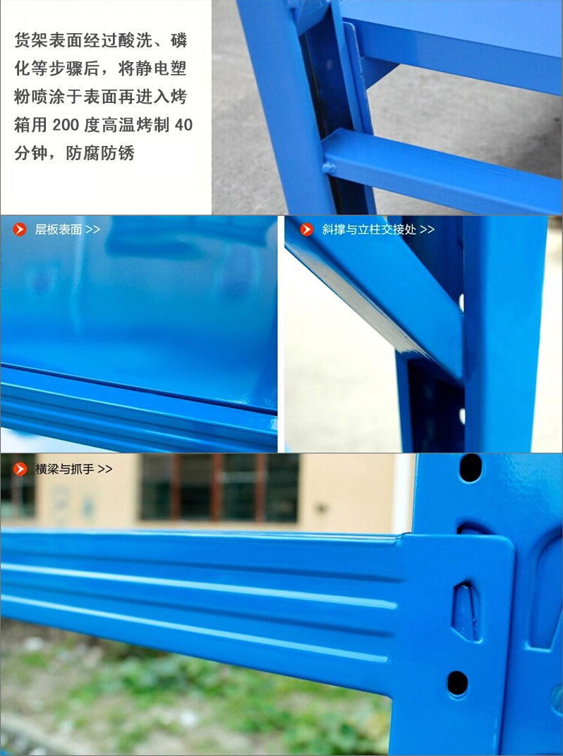 3、層板有木板和鋼板可供選擇,立柱高度設有每50mm調節孔距,可根據貨物高低調節層間使用。