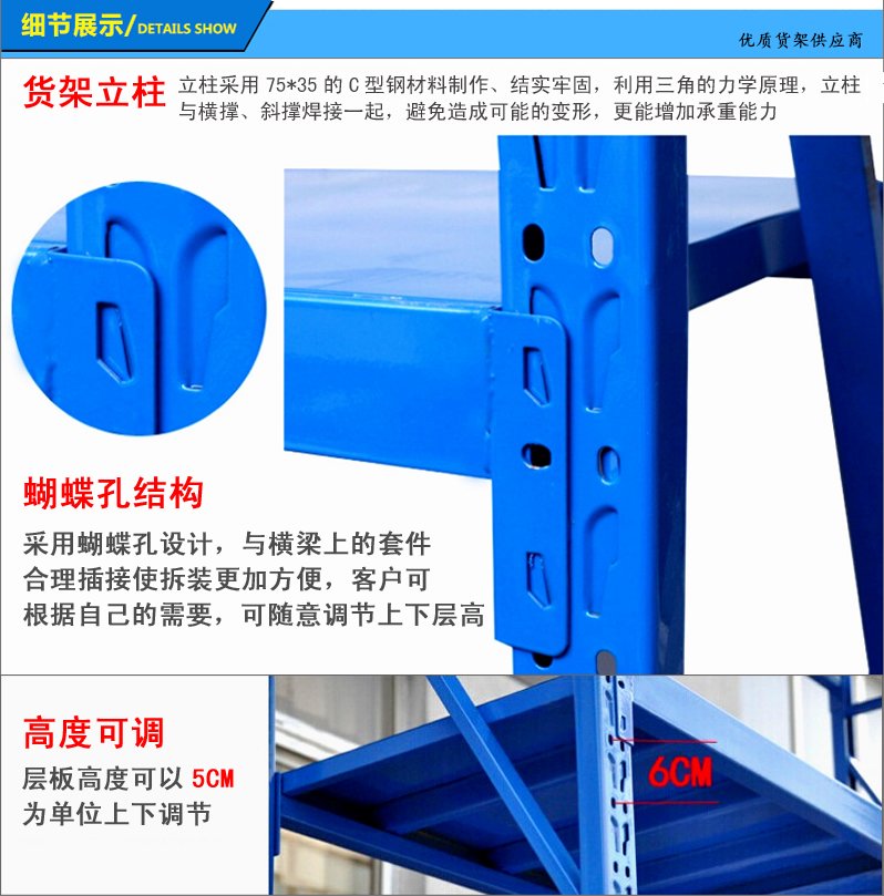 4、立柱設有每60mm調節孔距,可根據貨物高低任意調節。